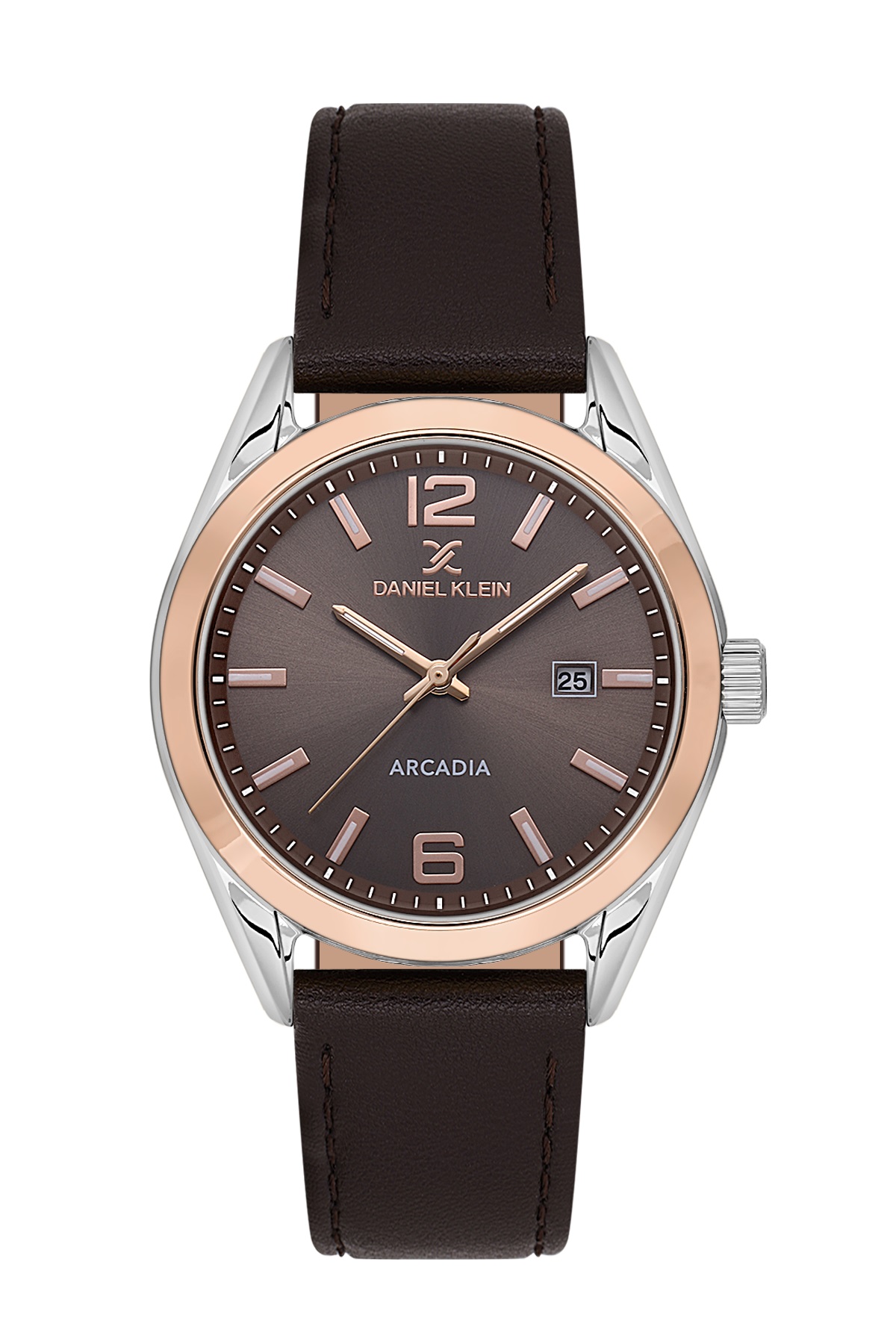 Циферблат выполнен в красивом, глубоком коричневом цвете, который переливается на свету и создает ощущение дороговизны. Метки и стрелки также имеют покрытие цвета розовое золото, что создает гармоничный дуэт с ободком корпуса. На циферблате нанесены две арабские цифры (12 и 6), остальные метки выполнены в виде четких рисок. Стрелки и метки оснащены светонакопительным покрытием (люминофор), что обеспечивает отличную читаемость времени даже в полной темноте. В левой части циферблата, на отметке «3 часа», расположено практичное окошко с датой – полезная функция для современного человека.