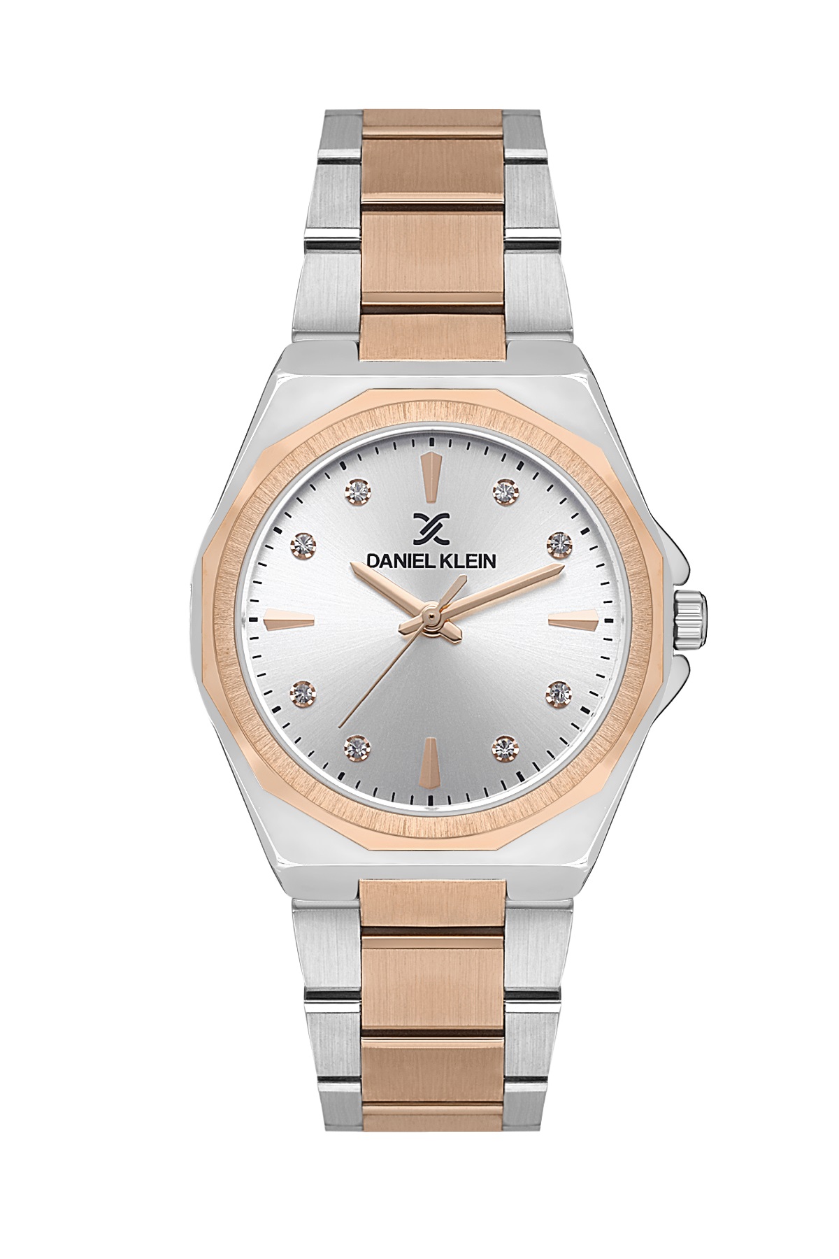 Главная особенность этих часов — элегантная игра контрастов. Круглый корпус диаметром 34 мм выполнен из высокопрочного сплава Alloy и покрыт износостойким IP-покрытием. Благодаря этой технологии корпус и браслет надежно защищены от потертостей и надолго сохраняют первозданный блеск. Дизайнеры Daniel Klein выбрали благородное сочетание серебра и розового золота: эта комбинация выглядит дорого и утонченно, делая часы универсальным украшением как для делового костюма, так и для вечернего платья.