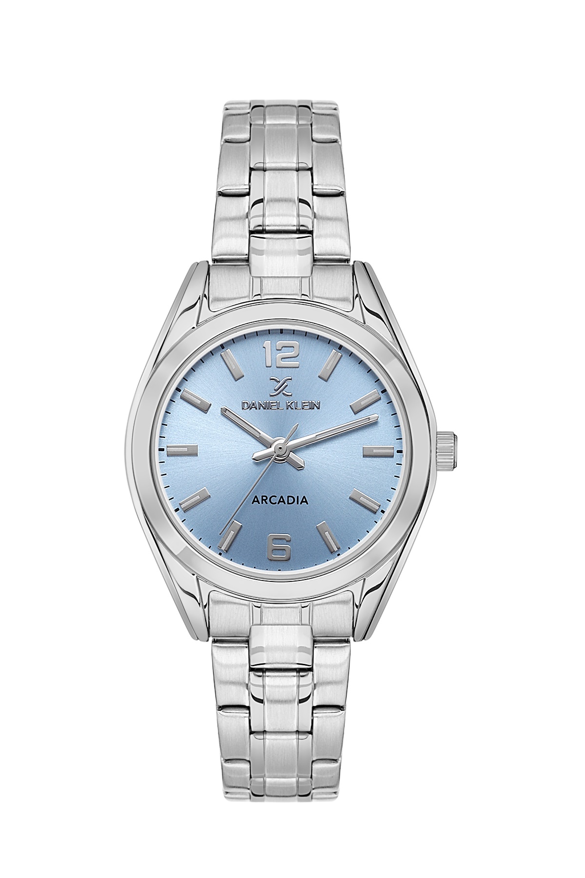 Серебристый круглый корпус диаметром 31 мм изготовлен из прочного сплава Alloy, который устойчив к механическим воздействиям и сохраняет безупречный внешний вид долгие годы. Особого внимания заслуживает нежный голубой циферблат, создающий ощущение свежести и легкости. В оформлении использованы серебристые стрелки и риски, а также изящные римские цифры на отметках «6» и «12», которые добавляют циферблату утонченности и отлично читаются благодаря контрасту с фоном.