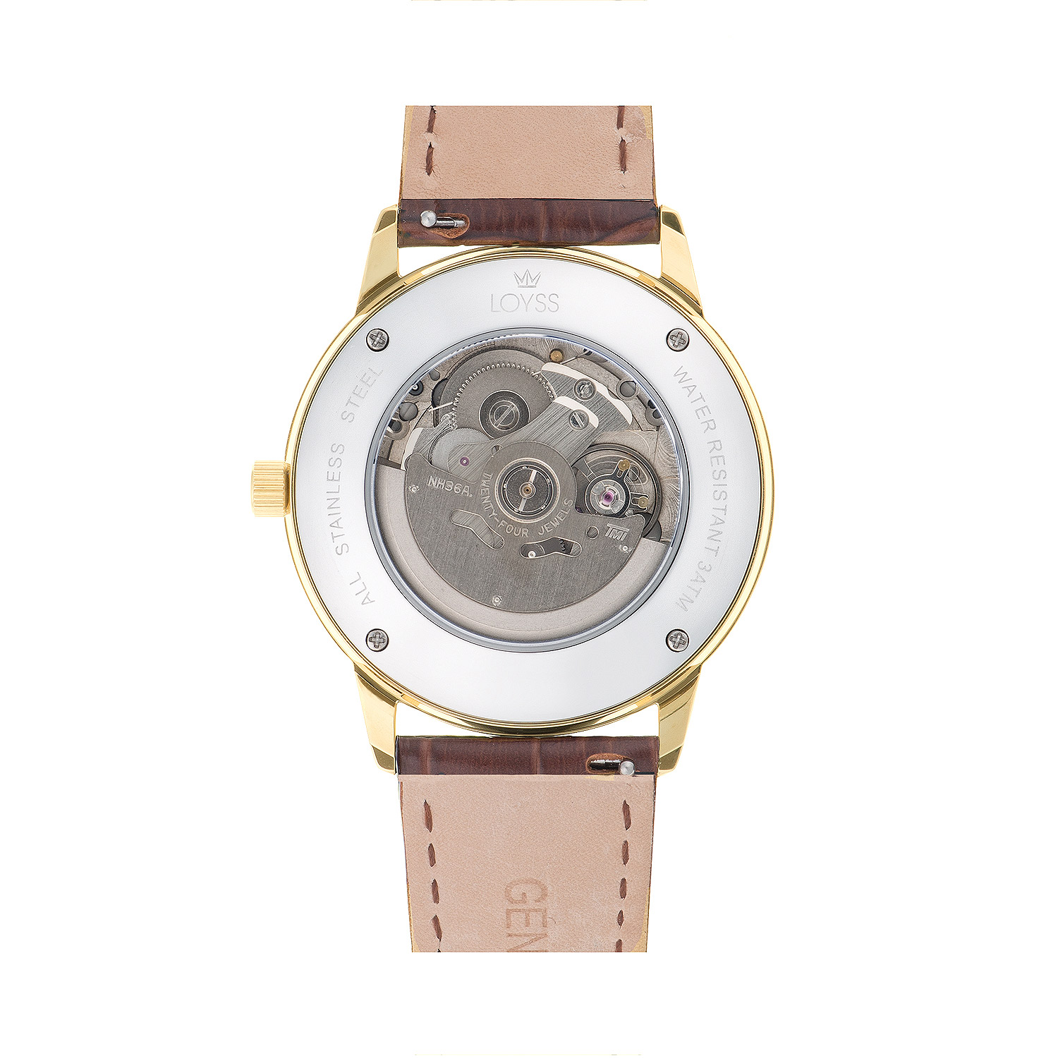 Особого внимания заслуживает ремешок: это натуральная кожа высшего качества коричневого цвета. Он мягкий, но при этом износостойкий, быстро принимает форму вашего запястья. Удобная и элегантная застежка-бабочка выполнена в цвет корпуса, что обеспечивает надежную фиксацию и изысканный внешний вид. Уникальной деталью является декоративный элемент внизу ремешка (в районе цифры «6»): это металлический кружок в цвет корпуса с изображением короны — часть фирменного логотипа Loyss, подчеркивающая эксклюзивность и внимание бренда к деталям.