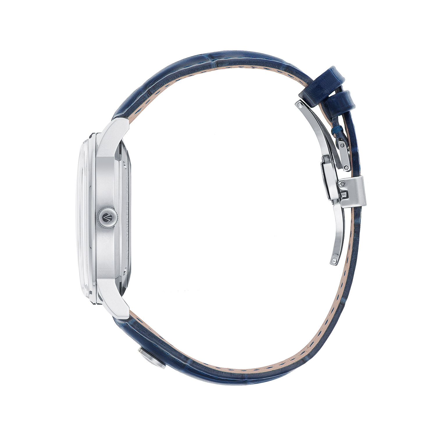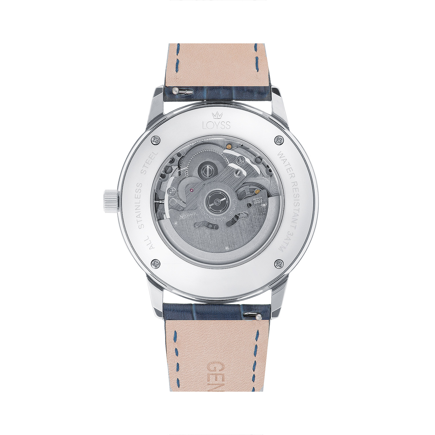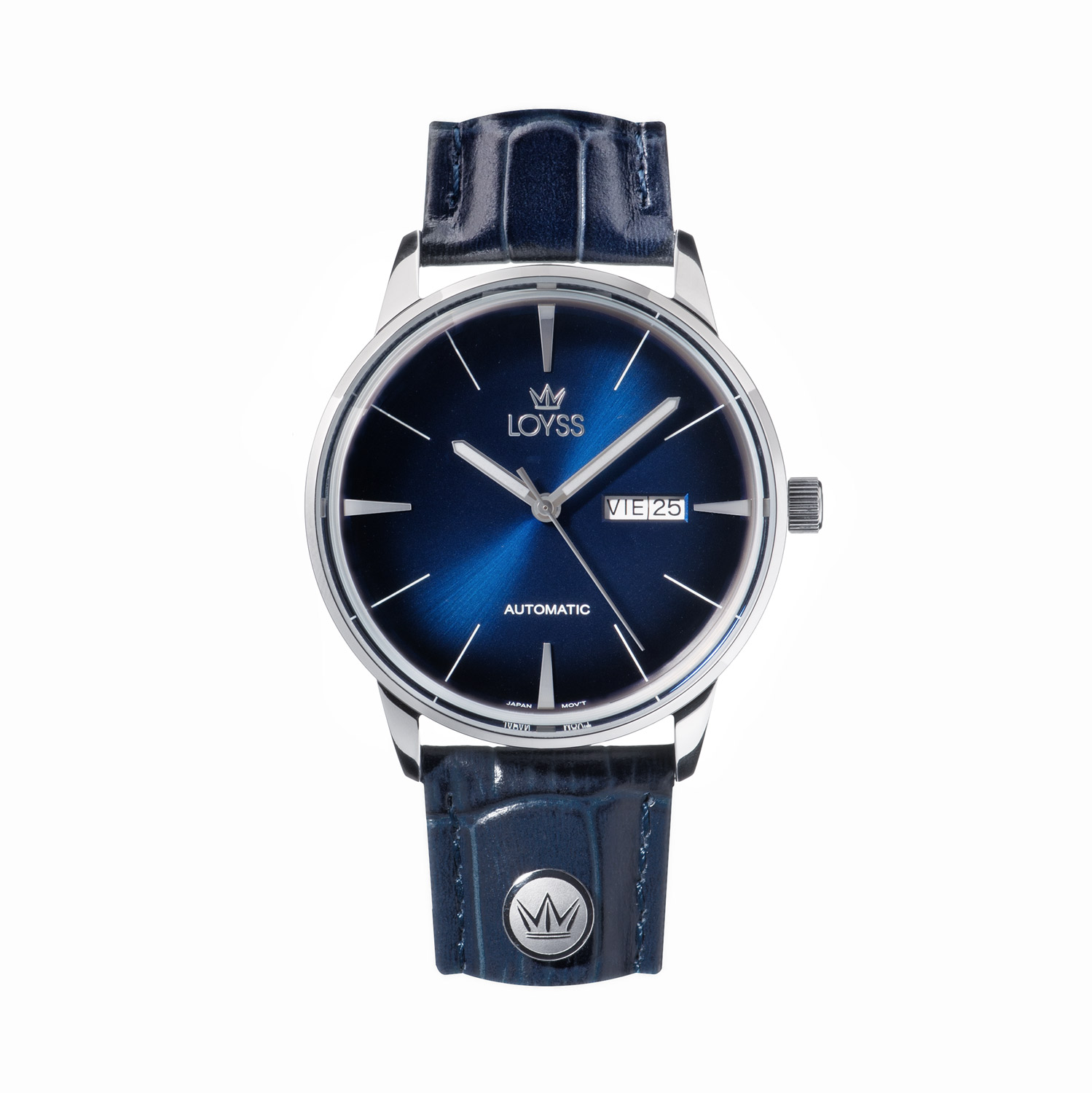 Особого внимания заслуживает оформление ремешка. Он выполнен из натуральной кожи глубокого синего цвета, который идеально гармонирует с циферблатом. Ремешок оснащен стильной застежкой-бабочкой, выполненной в цвет корпуса – она удобна в использовании и надежно фиксирует часы на руке, создавая эффект непрерывного браслета. Изюминкой дизайна стал декоративный элемент на ремешке в районе цифры «6»: небольшая круглая вставка в цвет корпуса, украшенная короной – частью фирменного логотипа Loyss. Эта деталь подчеркивает эксклюзивность модели и внимание бренда к деталям.