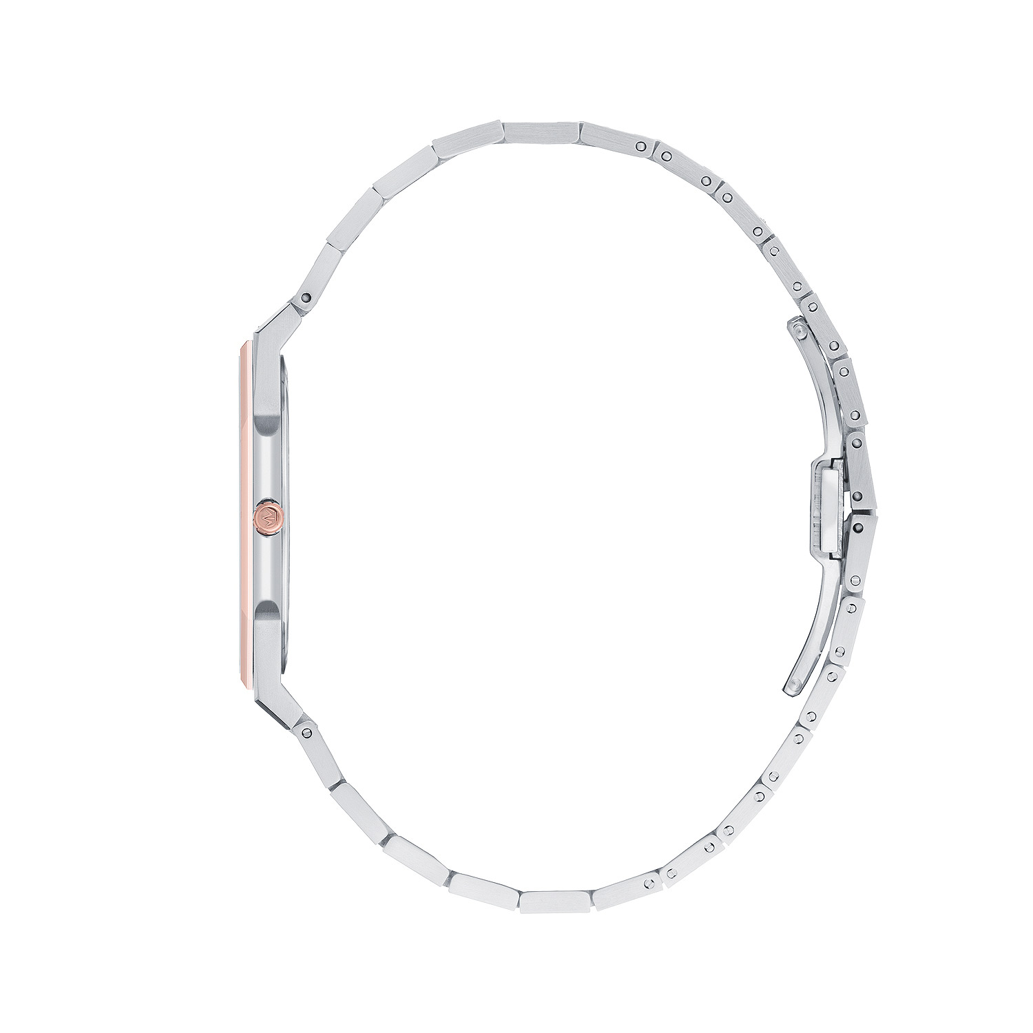 Браслет также выполнен из нержавеющей стали и повторяет элегантную комбинацию цветов: классический стальной цвет с центральными вставками розовое золото. Это создает законченный и стильный образ. Удобная застежка-бабочка обеспечивает надежную фиксацию, а конструкция браслета позволяет легко уменьшить его под любой размер запястья, подобрав идеальную посадку.
